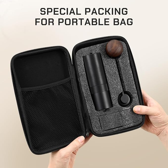 - Easy to Carry and Clean - Equipped with brush and storage pocket, easy to clean and store. Just simply clean the coffee grinder after use. DO NOT washable with water. The pocket stores the coffee bean grinder and can be taken anywhere. Suitable for camping, travel, outdoor activity, coffee festival.