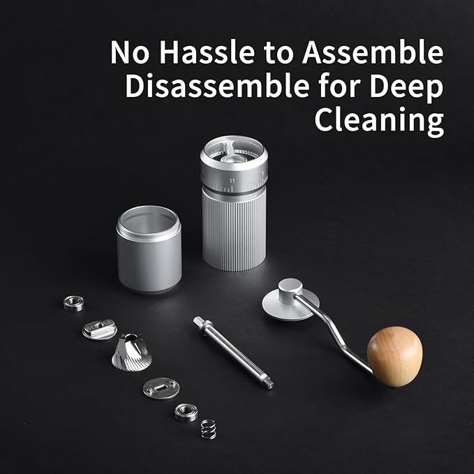 - PORTABLE AND EASY TO CLEAN — A simple twist separates the parts for cleaning, no tools required. This lightweight manual coffee grinders offers a touch of luxury in its portability and comes with a convenient storage bag, making it perfect for outdoor adventures. It's effortless to disassemble and clean thoroughly without any devices. The conical burr coffee grinder is relatively easy to take apart for cleaning. An espresso brush is included inside the coffee grinder espresso for superior cleaning results
