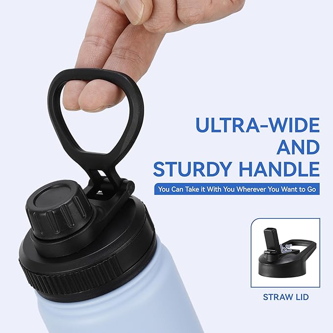 - Leak Proof: Two kinds of lids: Spout lid and flip lid, both of which can effectively prevent leaks. And the wide handle of the spout lid allows you to hold three fingers, reducing the pressure on your fingers when walking