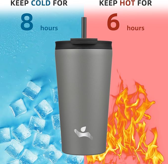 - The tumbler with straw lid is made of premium 18/8 stainless steel, double wall vacuum insulation keeps drinks cold for up to 8 hours and hot for up to 6 hours