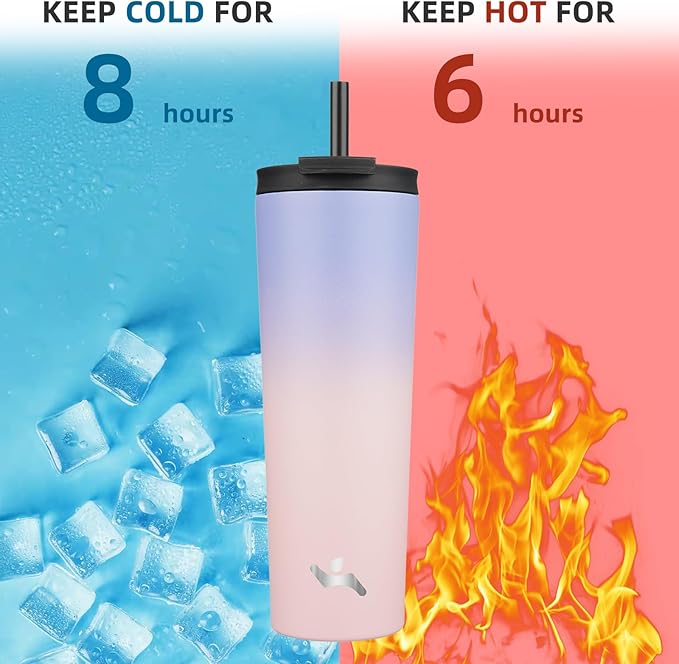 - The tumbler with straw lid is made of premium 18/8 stainless steel, double wall vacuum insulation keeps drinks cold for up to 8 hours and hot for up to 6 hours