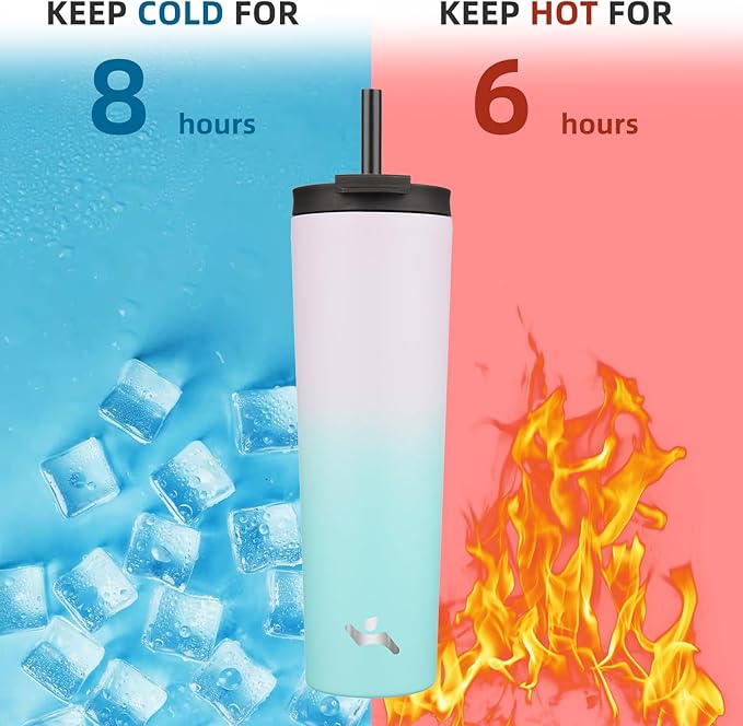- The tumbler with straw lid is made of premium 18/8 stainless steel, double wall vacuum insulation keeps drinks cold for up to 8 hours and hot for up to 6 hours