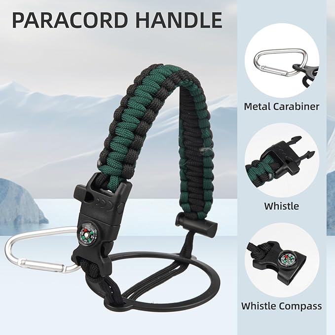 - The large capacity gallon water jug comes in various sizes, including 50 oz, 64 oz, 87 oz, and 128 oz, with a range of colors to choose from according to your need. All sizes of bottles equip with a paracord handle and a pouch for easy carrying