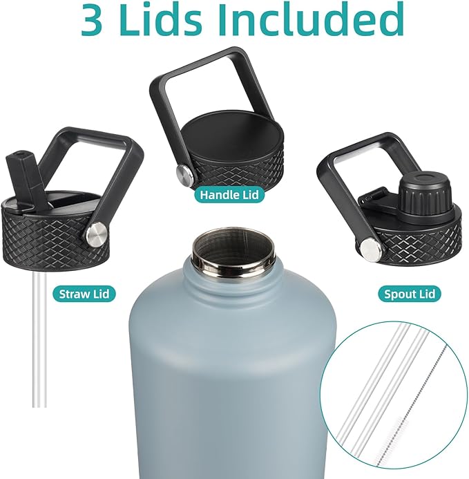 - The water bottle comes with 3 lids for different beverages, a sip lid for hot drinks, a straw lid for iced beverages, a flex-removable lid(2 different handle lids ship at random) for smoothies or fruit drinks. All lids are BPA-free, leak-proof, and dust-proof, catering to your need