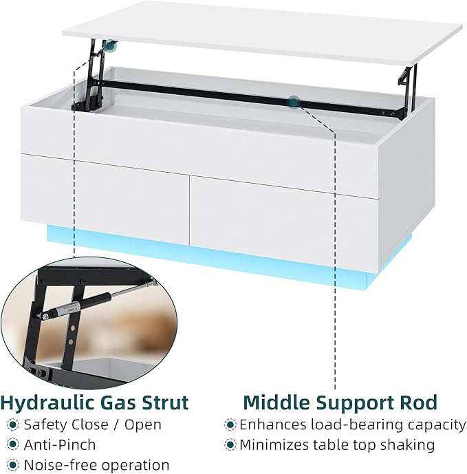 - Adjustable LED Coffee Table: Enhancing your room's aesthetic, this coffee lift top table offers over 60000 color variations and 29 flashing modes. An incorporated adjustable sensitivity mic allows the LED light to synchronize with sound and music rhythm, offering an enchanting experience