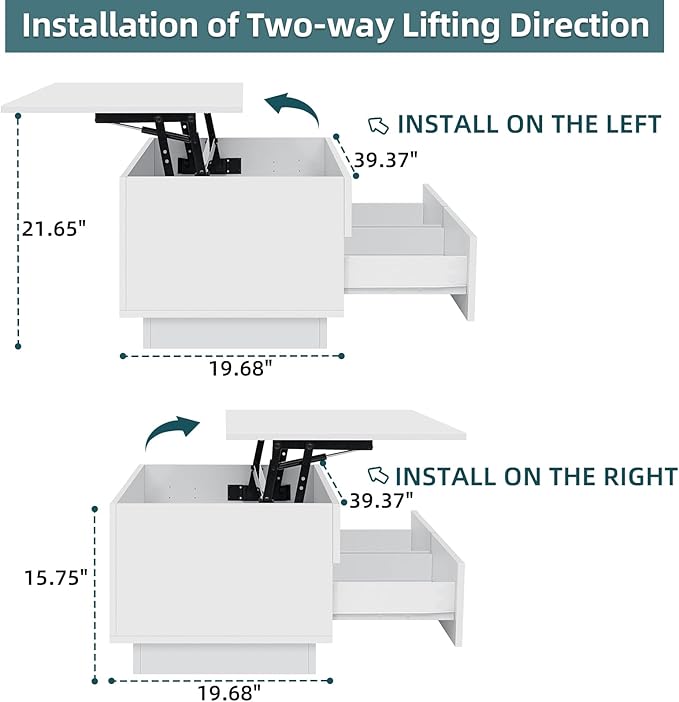- White Lift Top Coffee Table: The tabletop can be lifted and moved forward to create a decent workspace or dining space. The metal adjustment mechanism helps lift the tabletop from 15.75" to 21.65"