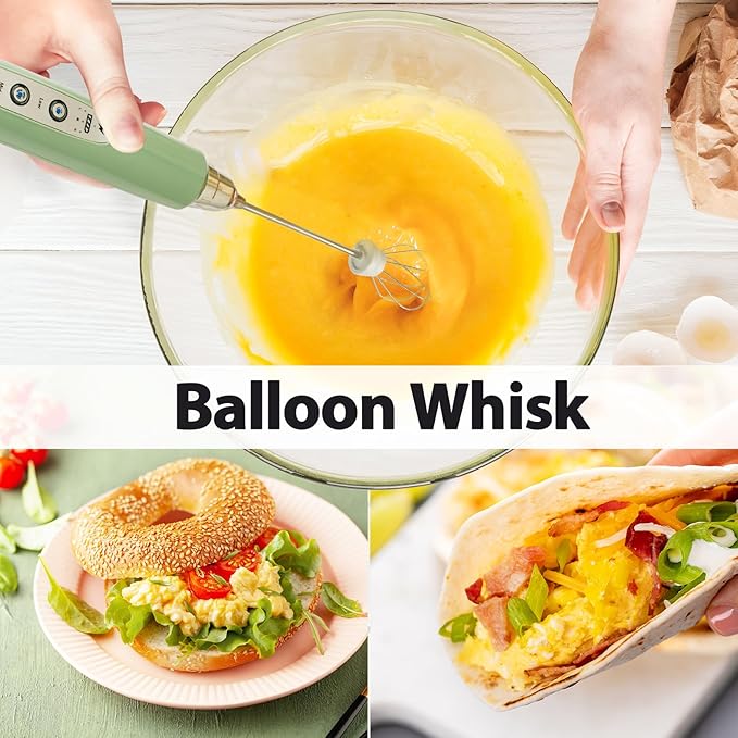 - 3 Whisks and 3 Speed Adjustable Frother : The matcha frother comes with 3 adjustable whisking speeds. SLOW SPEED for stirring egg yolks, powder drinks. MEDIUM SPEED for making jam, matcha tea. HIGH SPEED for milk or coffee froth, fluffy whipped cream, egg whites. Versatile 3 replaceable whisks: SPRING WHISK for creating milk and coffee froth, to make delicious drinks; BALLOON WHISK for mixing egg and whipping cream; HOOK WHISK for blending powders, making jam