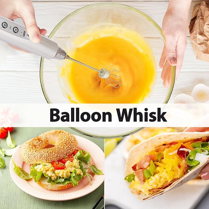 - 3 Whisks and 3 Speed Adjustable Frother : The matcha frother comes with 3 adjustable whisking speeds. SLOW SPEED for stirring egg yolks, powder drinks. MEDIUM SPEED for making jam, matcha tea. HIGH SPEED for milk or coffee froth, fluffy whipped cream, egg whites. Versatile 3 replaceable whisks: SPRING WHISK for creating milk and coffee froth, to make delicious drinks; BALLOON WHISK for mixing egg and whipping cream; HOOK WHISK for blending powders, making jam