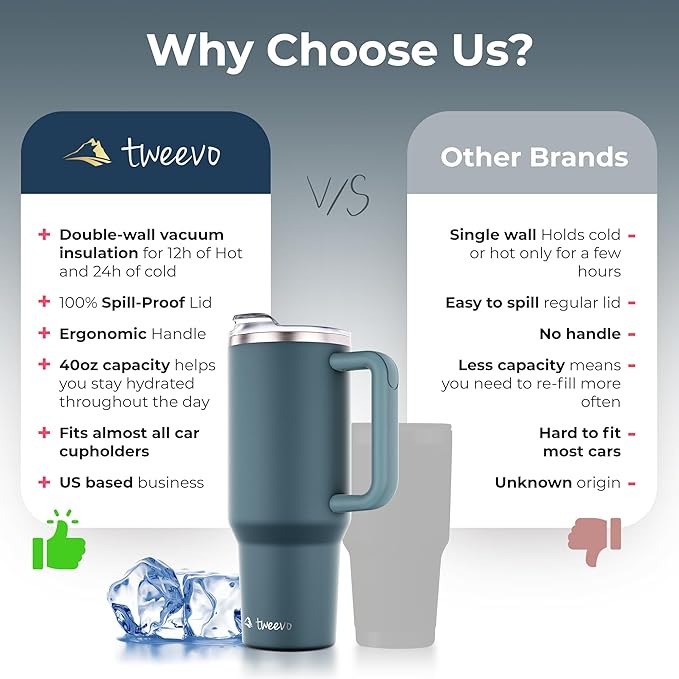 - Versatile insulated tumblers: With a large 40 oz capacity, this insulated tumbler is perfect for staying hydrated throughout the day. Whether you prefer iced drinks on a hot summer day or hot beverages during chilly mornings, this tumbler maintains your drink's temperature for hours.