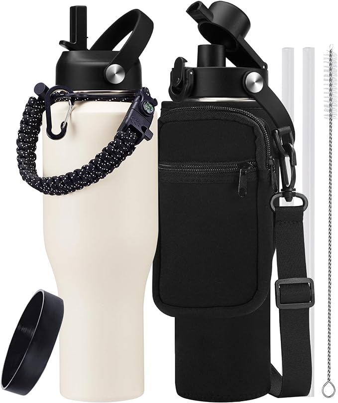 - PARACORD HANDLE & STRAP CARRIER BAG: Free your hands with the colorful paracord handle or adjustable shoulder strap.Compact compass, whistle, handy carabiner make the insulated water cup an ideal kit for expeditions in the wild.