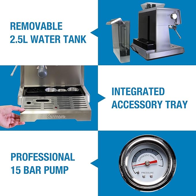 Kenmore Espresso Machine - Automatic Coffee Maker With Manual Tamper, Auto Cleaning, Milk Steamer & Frother, Bean Grinder, Make Professional Barista Style Cappuccino, Café Latte, Stainless Steel