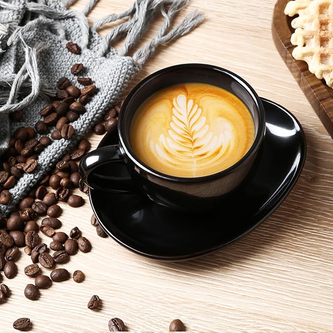 vicrays 6.5 oz Cappuccino Cups with Saucers, Set of 4, Ceramic Coffee Cup for Au Lait, Double shot, Latte, Cafe Mocha, Tea (Black)