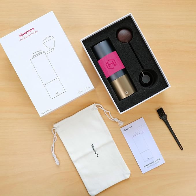 - TAKE IT EVERYWHERE - The HEIHOX hand coffee grinder takes up very little space (2.2X7 inches), is compact and lightweight. Grinds manually without batteries, electricity or cords. Ideal coffee grinder for making fresh ground coffee while camping, hiking, backpacking. This set includes a manual coffee grinder, cleaning brush and drawstring bag.