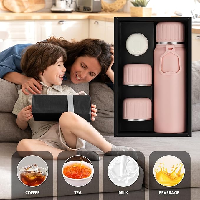750ml/27 OZ Coffee Thermo with 3 cups, Insulated Water Bottle, Stainless Steel Vacuum Flask Set for Hot and Cold Drinks, Gifts Box