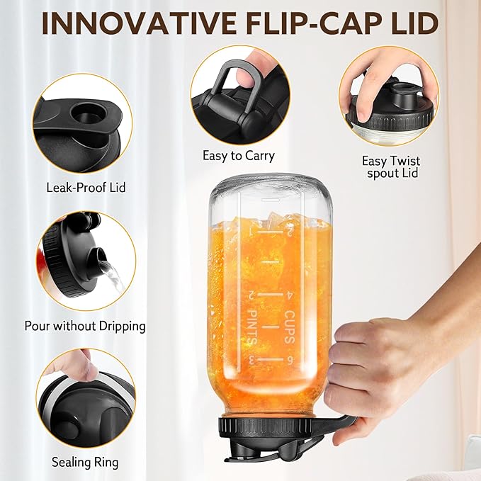 - [Leak-Proof & Spill-Proof]:Our 32 oz mason jar pitcher boasts a unique flip-cap lid with a leak-proof sealing gasket and a securely sealed cover, ensuring the freshness of your favorite beverages while also preventing any leaks. It is designed for easy and convenient opening, pouring, and closing, making it perfect for transporting your drinks.