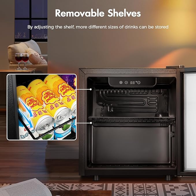 - Special Arcuate Rack for Wine Storing - Contains 1 adjustable and sturdy shelves, our cooler can conveniently store up to 48 standardized soda or beer cans. The specially designed arcuate rack not only keep wines from falling off but also makes maximum use of the cabinet space.