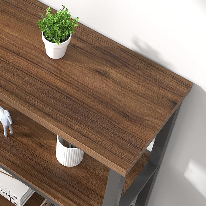 - Modern Bookcase : Rustic walnut wood grain finish with a black metal frame, seamlessly blending vintage and modern style. Minimalist vertical lines design for the short bookcase, exuding simplicity and elegance, perfect home decor.