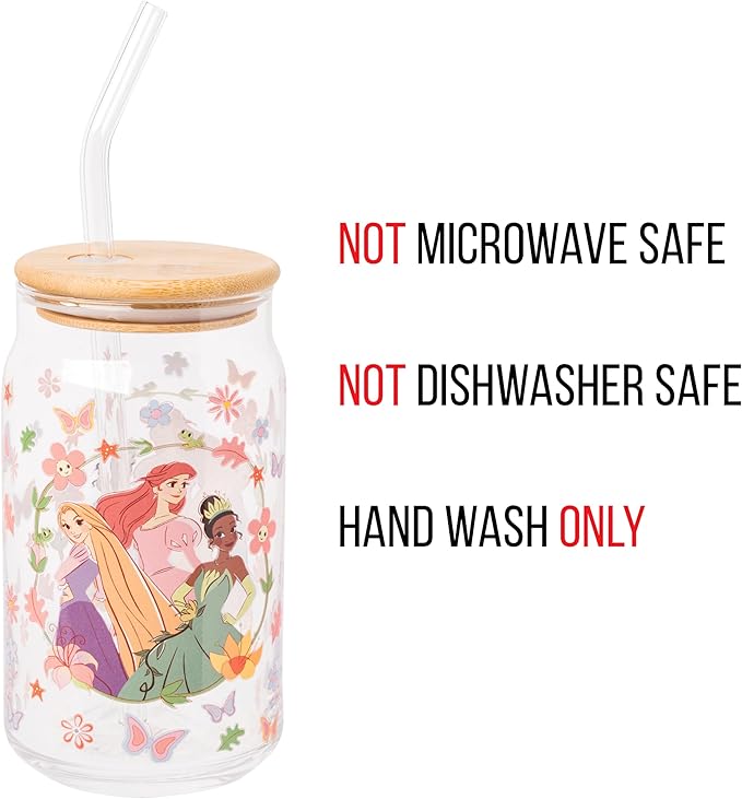 - DISNEY PRINCESS TUMBLER: Enhance your hydration experience with our enchanting 16-oz glass tumbler featuring a trio of beloved Disney Princesses that include Rapunzel, Ariel, and Tiana - amidst delicate Spring floral designs.