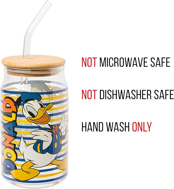 - Official Licensed Merchandise. Enjoy a refreshing drink in this adorable Disney Donald Duck 16oz Glass Tumbler with Bamboo Lid and Glass Straw. Featuring Donald Duck against a fun striped background.