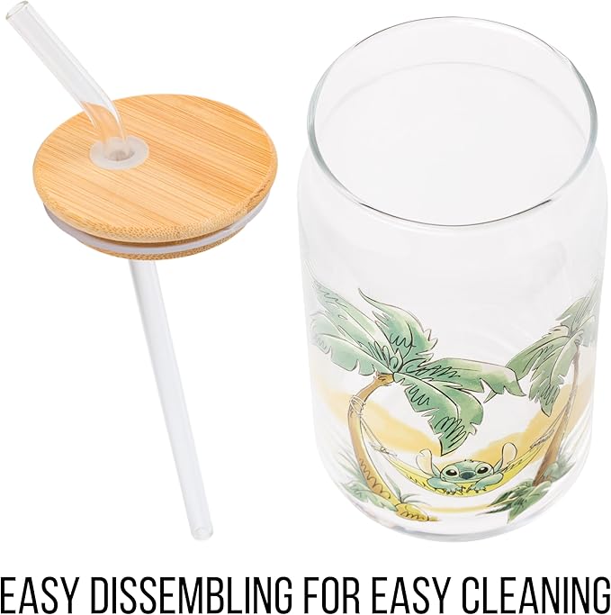 Silver Buffalo Disney Lilo and Stitch Relaxing Chilling in Hammock Island Glass Jar Tumbler with Bamboo Lid and Glass Straw, 16 Ounces