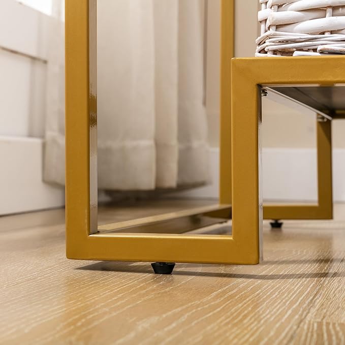 - Storage and sleek style make this end table a must-have contemporary addition to your living room. Its open frame is made from metal in an eye-catching brass line finish and features four adjustable feet button.