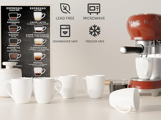 - Espresso Cups Meterial: exquisite 6 packs white coffee mugs made of stoneware, which is fired at a high temperature of about 1140℃-1280℃, makes stoneware have high strength and good thermal stability, at the same time lead-free, non-toxic, belongs to the good quality environmental protection products