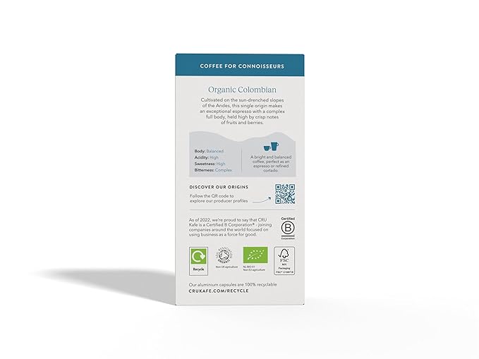 Cru Kafe Colombian USDA Organic Espresso Coffee Capsules (50 Pods) Fairtrade Coffee Pods Compatible with Nespresso Original Line and Pixie Machines