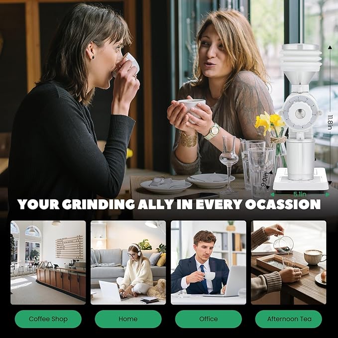 - [Highly efficient grinding] Featuring flat burrs measuring 60 mm and crafted from high hardness titanium, this espresso coffee grinder operates at an impressive 3000 RPM, ensuring fast, efficient, and consistent grinding. The flat burrs produce uniform flakes, enhancing the concentration and extraction rate of coffee liquid for a rich and aromatic brew