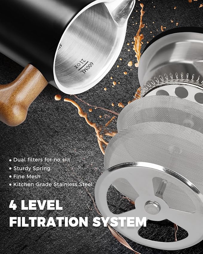 - SUPERIOR FILTRATION SYSTEM: This french press coffee maker is equipped with dual filters screens to minimize sediment in your cup, ensuring a clean and pure coffee experience. The package also comes with two replacement filters to extend the life of the coffee press.