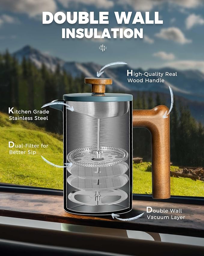 - SUPERIOR FILTRATION SYSTEM: This french press coffee maker is equipped with dual filters screens to minimize sediment in your cup, ensuring a clean and pure coffee experience. The package also comes with two replacement filters to extend the life of the coffee press.