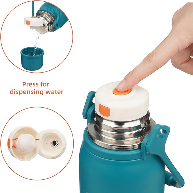- Double lid design ensures complete leak and dust proof. When closed, the inner sealing cap prevents any water from spilling out during moving. Push on the button on the nozzle, you can conveniently pour water into the small cup, which also serves as the outer lid