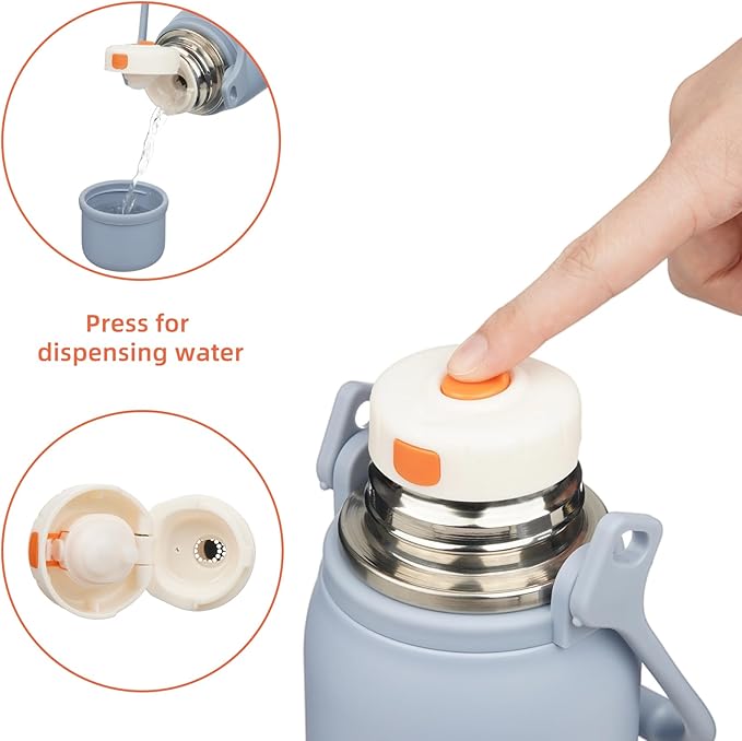 - Double lid design ensures complete leak and dust proof. When closed, the inner sealing cap prevents any water from spilling out during moving. Push on the button on the nozzle, you can conveniently pour water into the small cup, which also serves as the outer lid