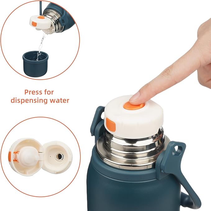 - Double lid design ensures complete leak and dust proof. When closed, the inner sealing cap prevents any water from spilling out during moving. Push on the button on the nozzle, you can conveniently pour water into the small cup, which also serves as the outer lid