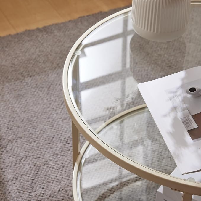 VINGLI Glass Coffee Table, 30" Round Coffee Table, Transparent Glass Coffee Tables for Living Room, 2-Tier Coffee Table with Storage, Modern Center Table with a Beige Frame, Mesa de Centro para Sala