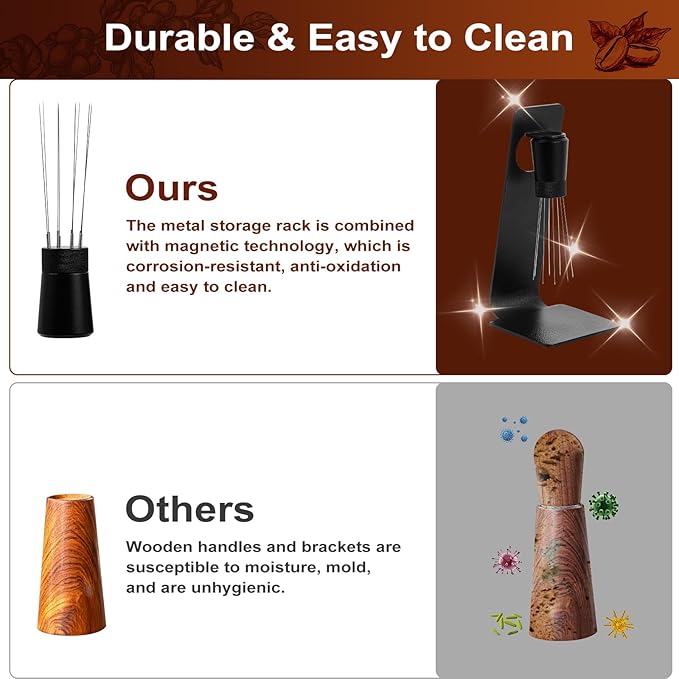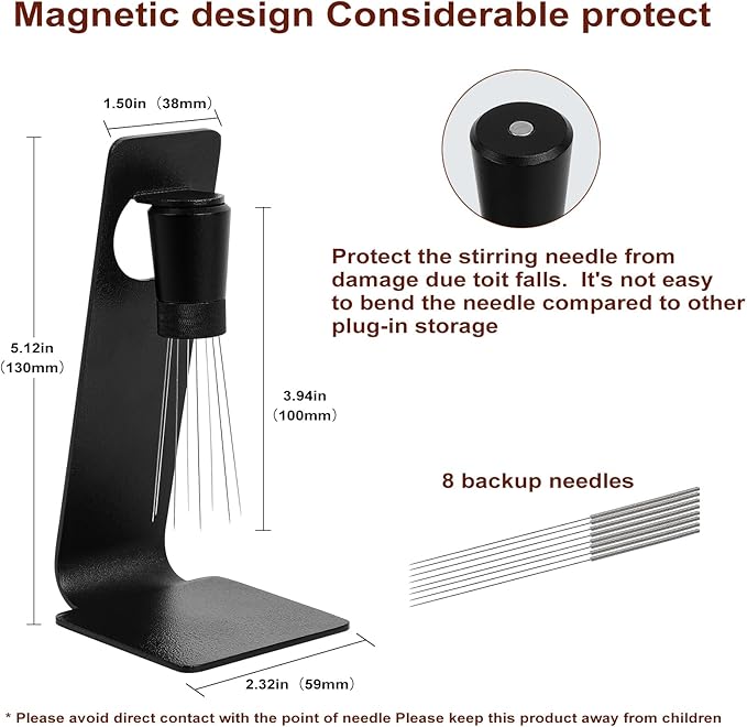 - About Coffee Distribution Stirrer: Espresso WDT Tool-Coffee Distribution Stirrer has up to 8 needles. It is designed to break up clumps,create a uniform coffee bed, and ensure a consistent density in your basket. Only 0.25mm needle promotes better extraction, resulting in a smoother espresso. The agitator is fixed on the design of the iron frame by magnetic suction, which can ensure the perfect preservation and ventilation of the mixing needle, and is not easy to deformation.