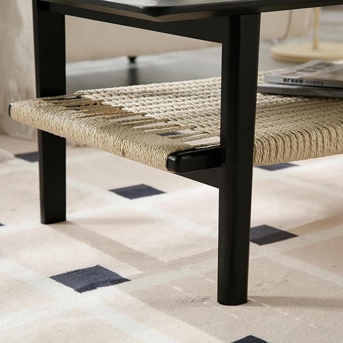 Kmax Coffee Table with Storage, Black Coffee Table Farmhouse Living Room Tables Rectangular Center Table with Rope Woven/Rattan Storage Shelf for Living Room Reception