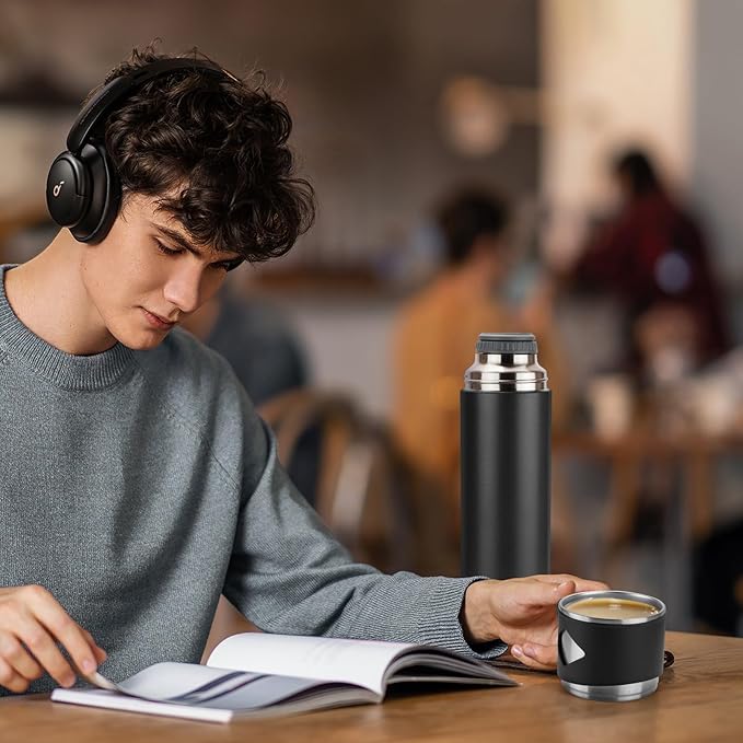 Stainless Steel Thermo 23.7oz Vacuum Insulated Bottle with Cup for Coffee Hot drink and Cold drink water flask.(Black,Single)