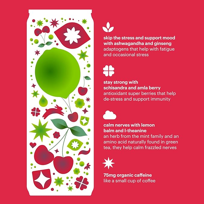 - ENERGY VARIETY PACK: Try several of our most popular flavors, each with 75 MGs of organic caffeine (like a small cup of coffee). Energy + Focus sparkling strawberry lemon helps sustain energy and concentration with L-theanine and Ashwagandha. Energy + Lift Cherry Limeade helps support mood with Ashwagandha and Ginseng, and NEW Energy + Hydrate Lemon Fizz helps support hydration with natural electrolytes like magnesium, potassium and pink Himalayan Sea Salt.