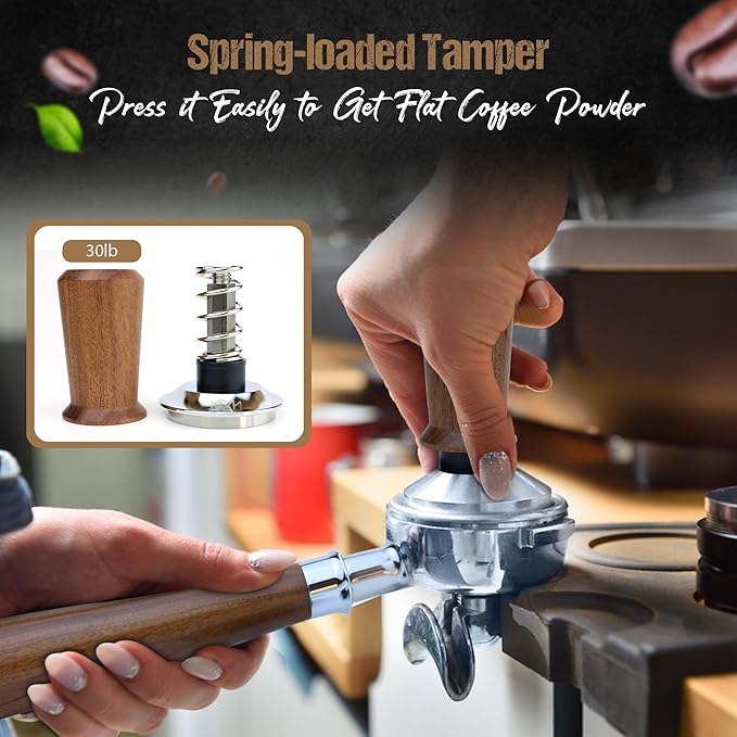 - Enhanced Brewing Control: The 54mm bottomless portafilter allows visual feedback during extraction, giving you precise control. The included 18g filter basket, 53.3mm tamper with constant 30lb calibrated spring loaded and 1.7mm puck screen ensures even distribution of coffee grounds for consistently perfect espresso shots.