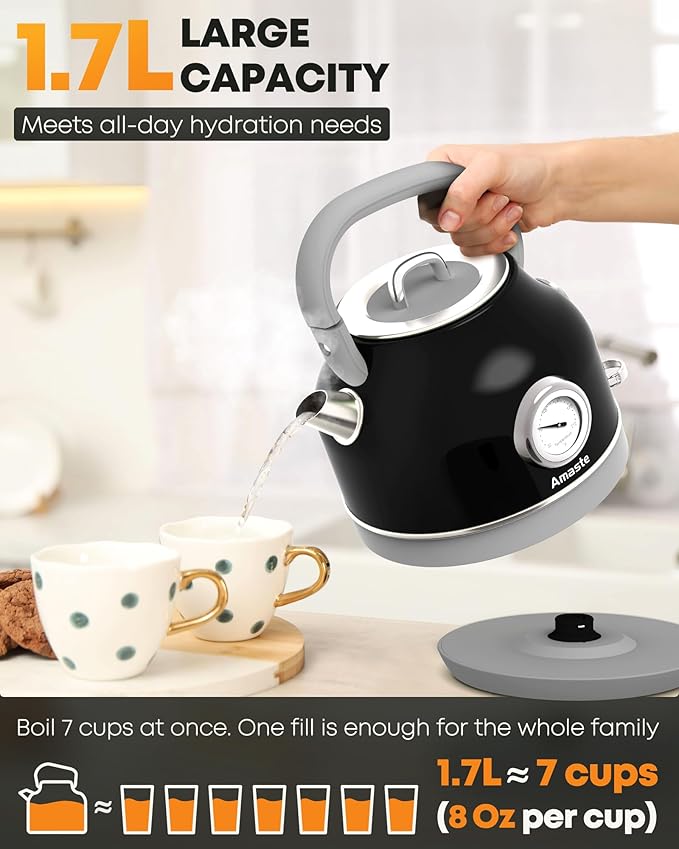 Amaste Electric Kettle, Retro Electric Tea Kettle With Thermometer, 57 Oz Hot Water Kettle For Coffee & Tea, 304 Stainless Steel, 1500w Fast Boiling, Auto Shut-Off & Boil Dry Protection, Black
