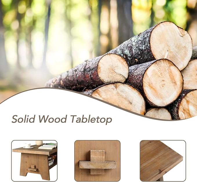 Farmhouse Wood Coffee Table - 43.4” Mid Century Modern Wooden Coffee Tables for Living Room, Solid Firwood Tabletop Rectangle Coffee Table, Center Table for Living Room, Brown