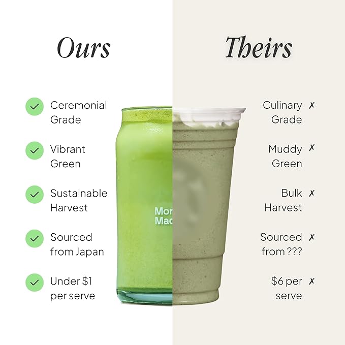 - CAFÉ-QUALITY MADE AFFORDABLE: Enjoy barista-level matcha at home for less than $1 per serve. Crafted with organic green tea leaves that are shade-grown and steamed to preserve their vibrant colour and rich nutrients.