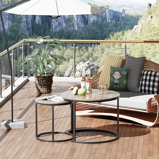- 【COMBIME AS YOU LIKE】 Nesting coffee tables include a large table (Φ 23.6 × 17.7 inch) and a small table (Φ 15.7 × 15.7 inch). A small table can be placed under the bigger one. You can combine them as you like