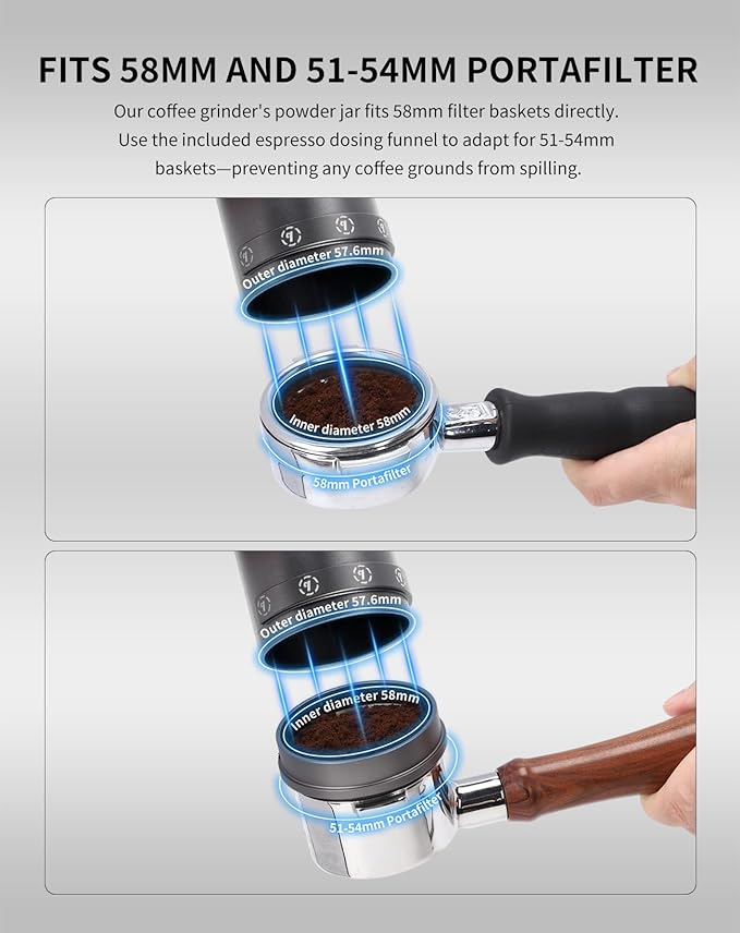 - 🍵Capacity: The single dose coffee grinder's powder compartment, holding up to 65g of coffee powder, is ideally designed for spill-free filling of a 58mm filter basket, making it perfectly compatible with espresso machines. It can grind 30g of beans at once or 65g with the removable rubber bellows, providing enough coffee for 4 cups or for a 1000ml French press. Compatible with worldwide voltage 100V–240V (including 220V).