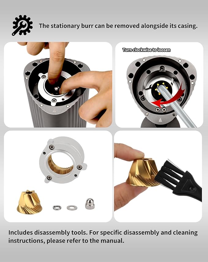 - 🎯Durable Material: The high-strength, wear-resistant 420 stainless steel conical burr of this espresso grinder is precision-crafted using a five-axis CNC machine, enhanced with a titanium nitride (TiN) coating for greater hardness and reduced powder adhesion. Its unique Reuleaux Triangle-shaped body offers a space-saving, efficient, and long-lasting design.