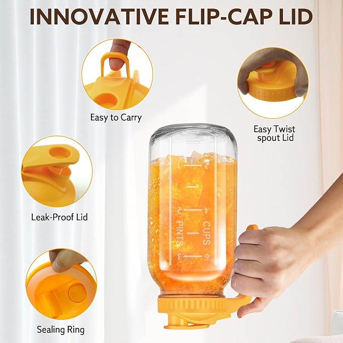 - [Leak-Proof & Spill-Proof]:Our 32 oz mason jar pitcher boasts a unique flip-cap lid with a leak-proof sealing gasket and a securely sealed cover, ensuring the freshness of your favorite beverages while also preventing any leaks. It is designed for easy and convenient opening, pouring, and closing, making it perfect for transporting your drinks.