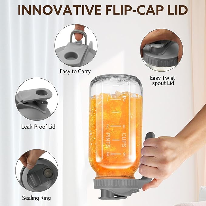 - [Leak-Proof & Spill-Proof]:Our 32 oz mason jar pitcher boasts a unique flip-cap lid with a leak-proof sealing gasket and a securely sealed cover, ensuring the freshness of your favorite beverages while also preventing any leaks. It is designed for easy and convenient opening, pouring, and closing, making it perfect for transporting your drinks.