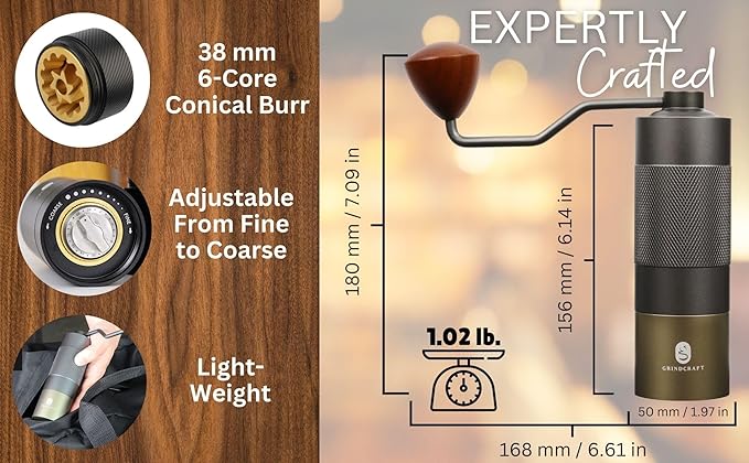 - Unparalleled Precision – Extract rich, enticing aroma and flavor from every bean with this manual burr grinder by Grindcraft. Its 38mm 6-core 420 Stainless Steel with Titanium plated burrs deliver a uniform grind and uplifting taste.
