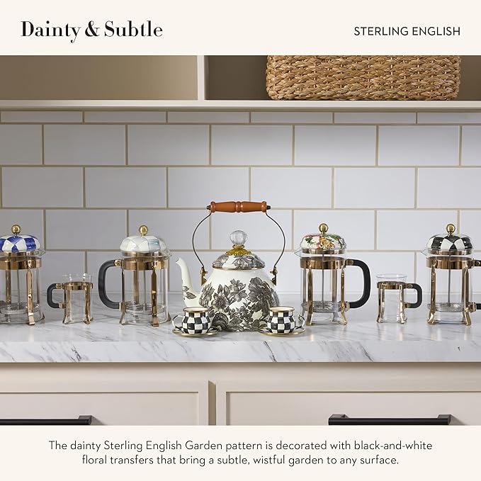 - ELEGANT FLORAL TEA KETTLE: The dainty Sterling English Garden stove kettle features a white hand-glazed heavy-gauge steel underbody decorated with black-and-white flowers. It’s topped with a wood handle and a clear glass knob.