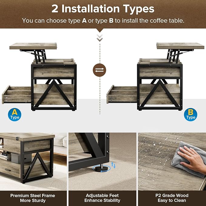 - 【Upgrade Design】High quality metal lift structure ensures smooth and even lifting and lowering of the tabletop,The sturdy steel frame ensures this lift top coffee table is stable and strong.The high quality particle board is CARB P2 certified,The desktop is waterproof and resistant to scratches.